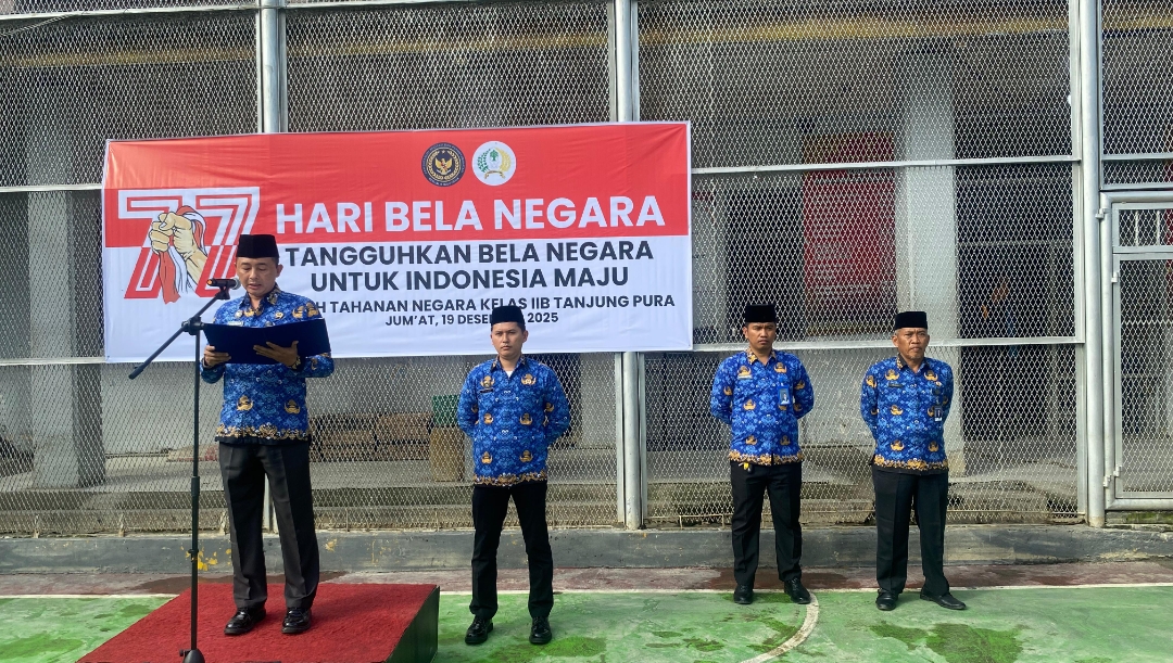 GIMIC.ID, TANJUNG PURA— Rumah Tahanan Negara (Rutan) Kelas IIB Tanjung Pura menggelar upacara Peringatan Hari Bela Negara ke-77 Tahun 2025 dengan mengusung tema “Teguhkan Bela Negara Untuk Indonesia Maju”. Kegiatan tersebut berlangsung khidmat di Lapangan Rutan Tanjung Pura, Jumat (19/12/2025).