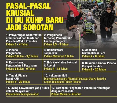 Berdasarkan rangkuman yang beredar, setidaknya terdapat 12 pasal krusial dalam UU KUHP baru yang menjadi perhatian publik, di antaranya: