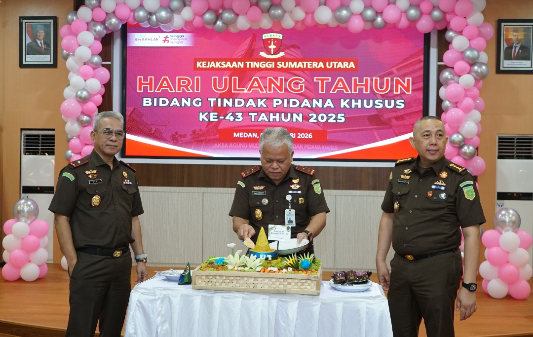 Kepala Kejaksaan Tinggi Sumatera Utara Dr. Harli Siregar didampingi Wakajati Sumut dan jajaran pejabat Kejati Sumut memotong tumpeng pada peringatan HUT ke-43 Bidang Tindak Pidana Khusus Kejaksaan RI yang digelar secara daring di Aula Kejati Sumut, Medan.
