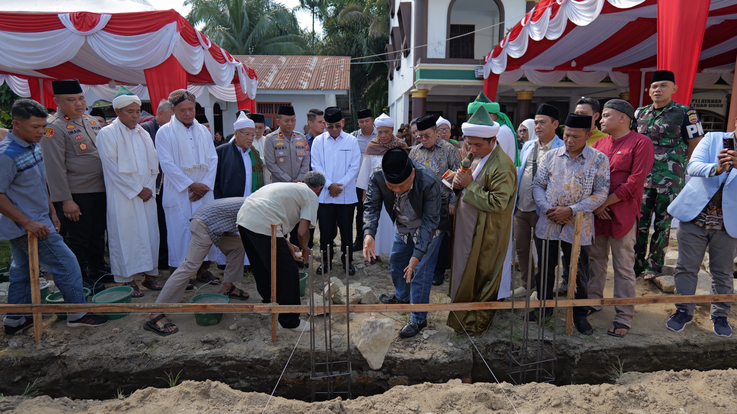 Prosesi peletakan batu pertama pembangunan Rumah Tahfiz Sugiat Santoso di Serambi Babussalam, Simalungun, disaksikan tokoh agama, masyarakat, serta unsur TNI–Polri.