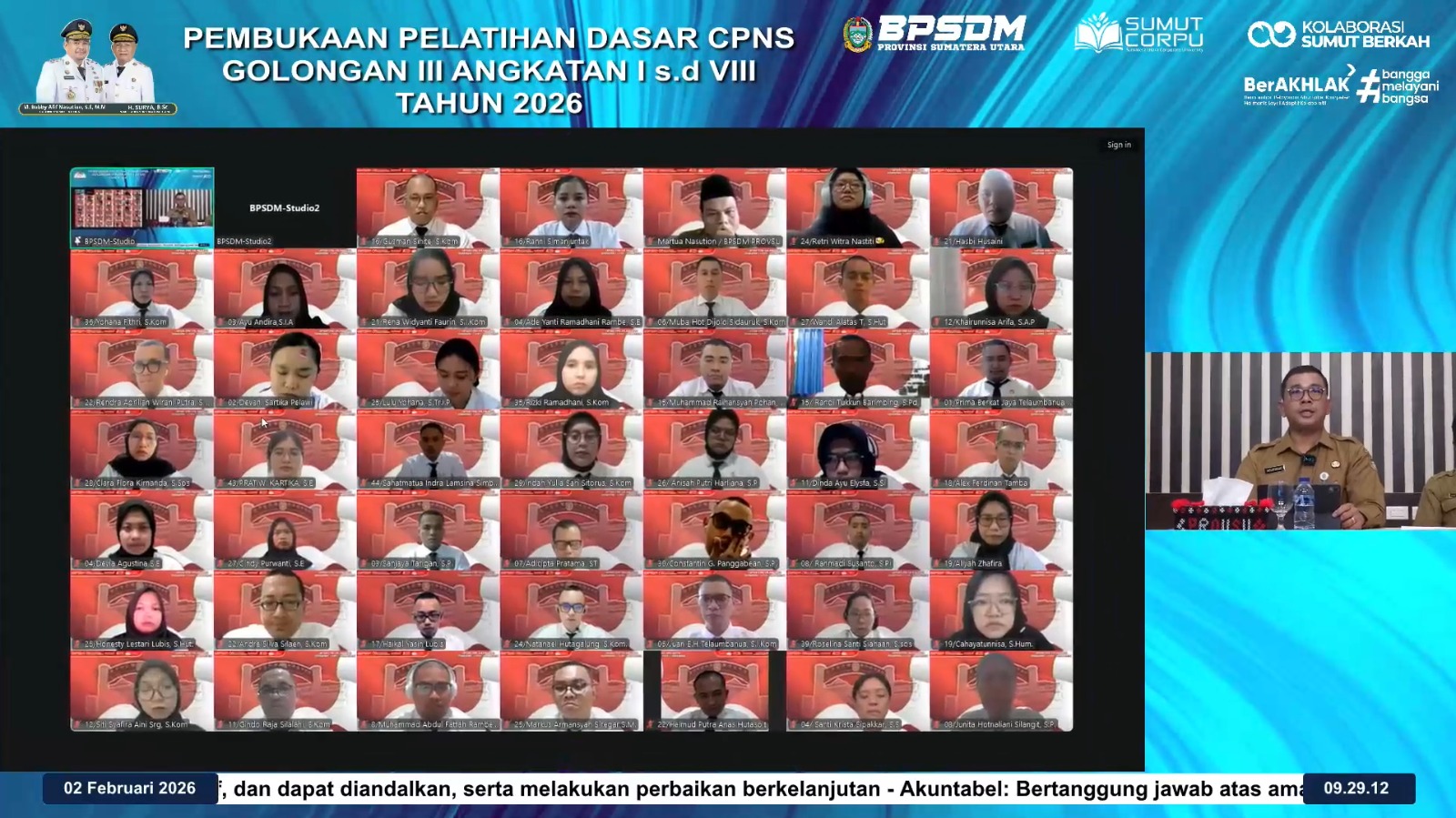 Pembukaan Pelatihan Dasar (Latsar) CPNS Golongan III Angkatan I–VIII Tahun 2026 oleh BPSDM Provinsi Sumatera Utara yang digelar secara daring, diikuti ratusan peserta dari berbagai OPD guna membentuk ASN profesional, adaptif, dan berorientasi pelayanan publik.