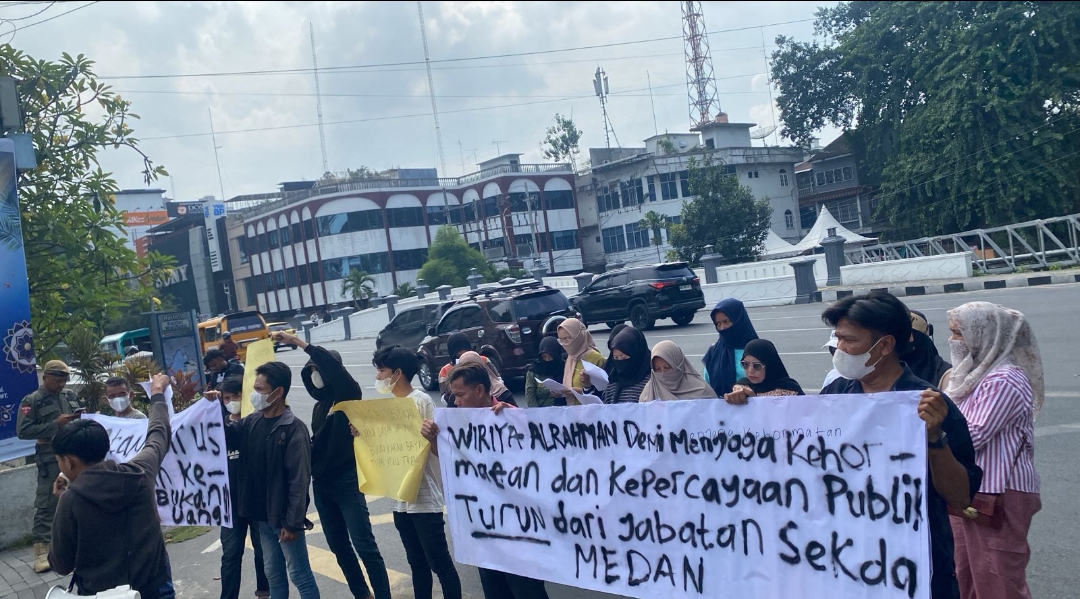 Massa GARUDA Kota Medan menggelar aksi di Kantor Wali Kota Medan, mendesak pencopotan Sekda terkait dugaan praktik mutasi ASN bermasalah.