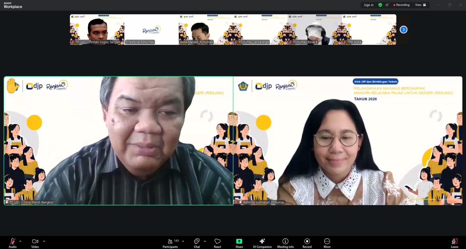 Staf Tax Centre USU Indra Efendi Rangkuti mewakili Tax Centre USU menerima penghargaan Program Renjani Terintegrasi MBKM Terbaik Nasional 2025" pada 19 Februari 2026 secara daring