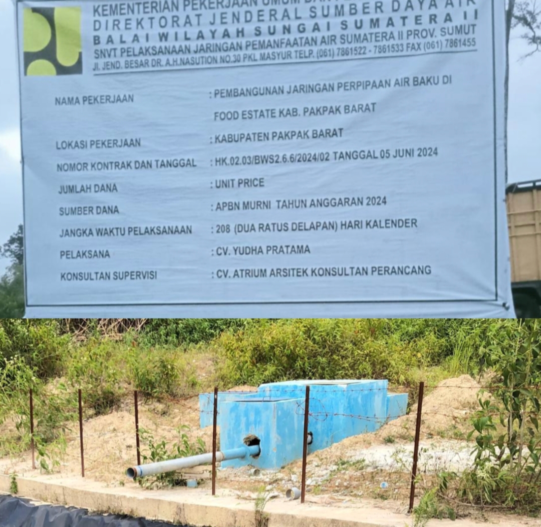 Plang proyek Pembangunan Jaringan Perpipaan Air Baku di kawasan Food Estate Kabupaten Pakpak Bharat Tahun Anggaran 2024 yang bersumber dari APBN, dengan pelaksana CV Yudha Pratama dan konsultan supervisi CV Atrium Arsitek Konsultan Perancang. Tampak salah satu bangunan bak air di lokasi proyek.