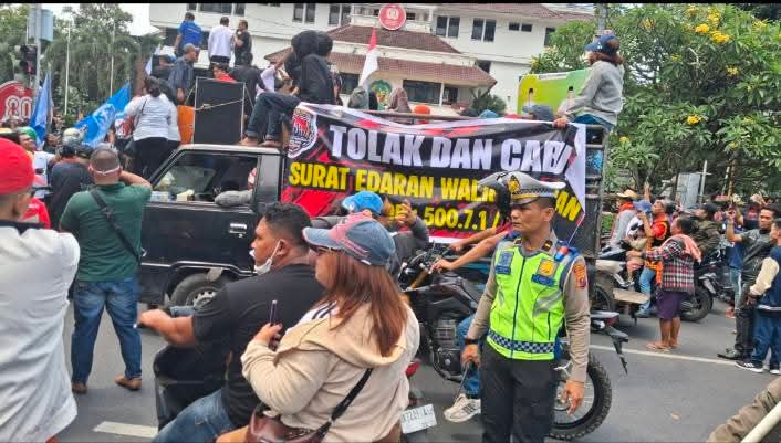 Aksi berlangsung tegang ketika massa meminta Pemerintah Kota Medan mencabut surat edaran tersebut. Sejumlah spanduk dan poster dibentangkan sebagai bentuk penolakan terhadap kebijakan yang dianggap berdampak langsung terhadap mata pencaharian mereka.