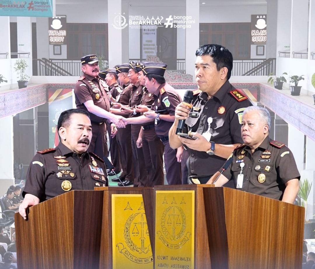 Jaksa Agung RI memberikan arahan kepada jajaran Kepala Kejaksaan Negeri dan pejabat di lingkungan Kejaksaan Tinggi Sumatera Utara saat kunjungan kerja di Medan. Kegiatan tersebut menegaskan komitmen penguatan integritas, profesionalisme, dan soliditas insan Adhyaksa di wilayah Sumatera Utara.