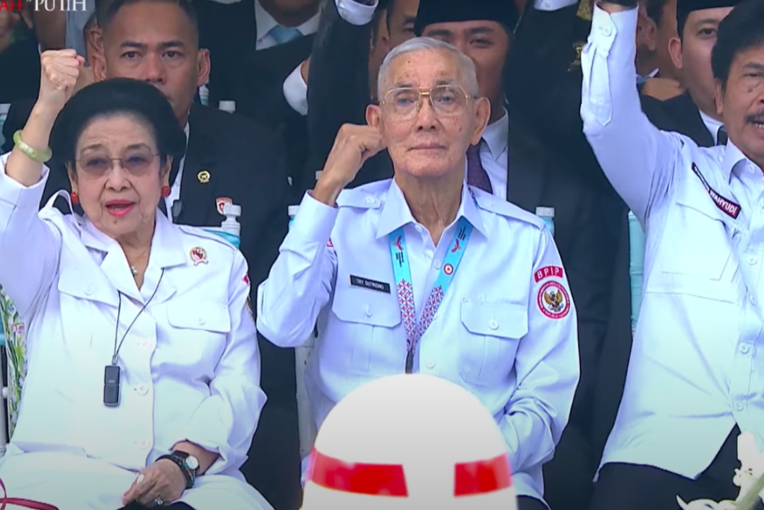 Wakil Presiden ke-6 Republik Indonesia, Try Sutrisno (tengah), bersama sejumlah tokoh nasional menghadiri sebuah acara kenegaraan. Dalam momen tersebut, Try Sutrisno tampak mengangkat tangan sebagai bentuk semangat dan dukungan, didampingi para pejabat yang mengenakan atribut resmi BPIP.