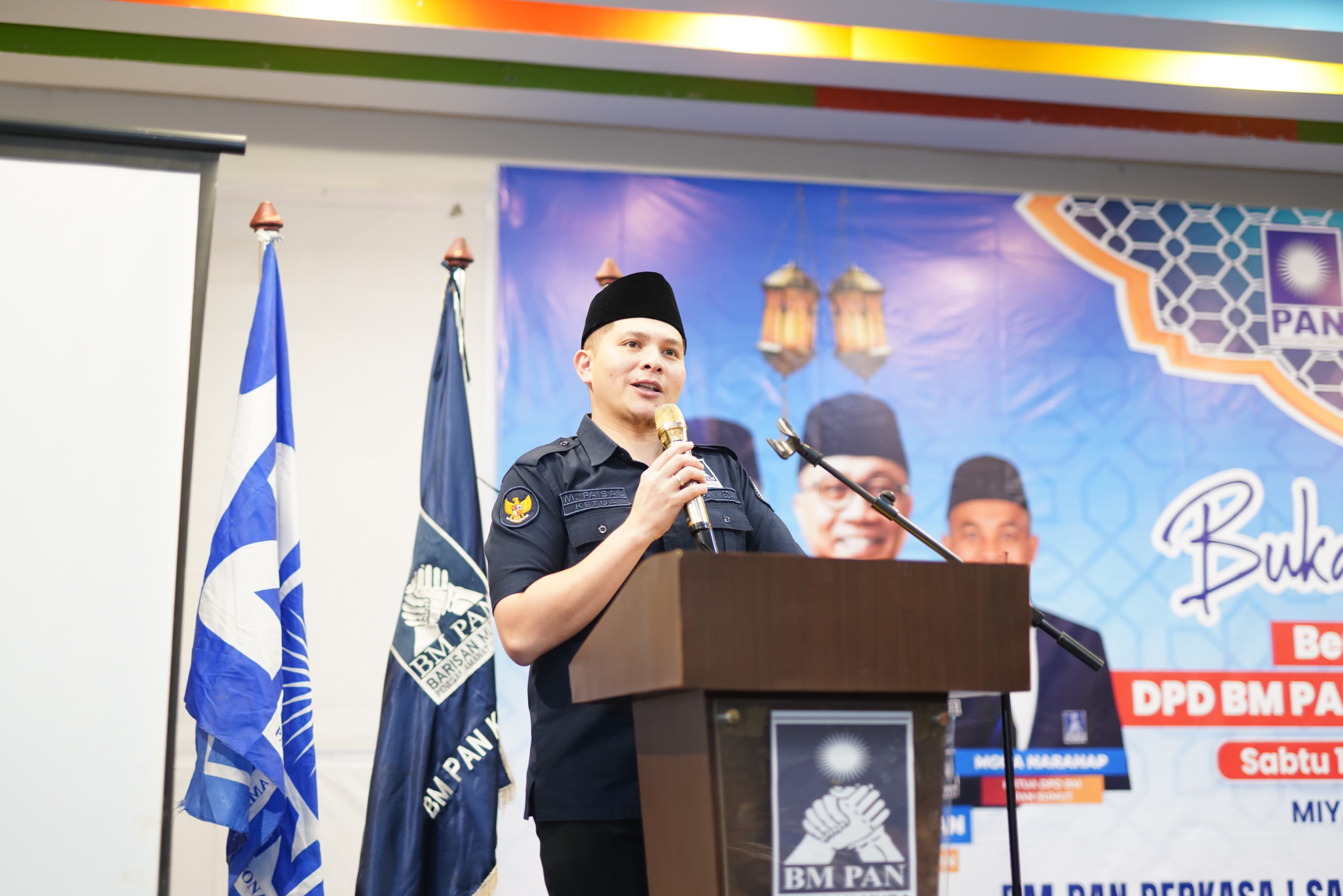 Ketua DPD Barisan Muda Penegak Amanat Nasional (BM PAN) Kota Medan menyampaikan sambutan saat kegiatan buka puasa bersama kader yang digelar di Hotel Miyana, Sabtu (14/3/2026), sebagai momentum mempererat silaturahmi antar kader di bulan Ramadan.