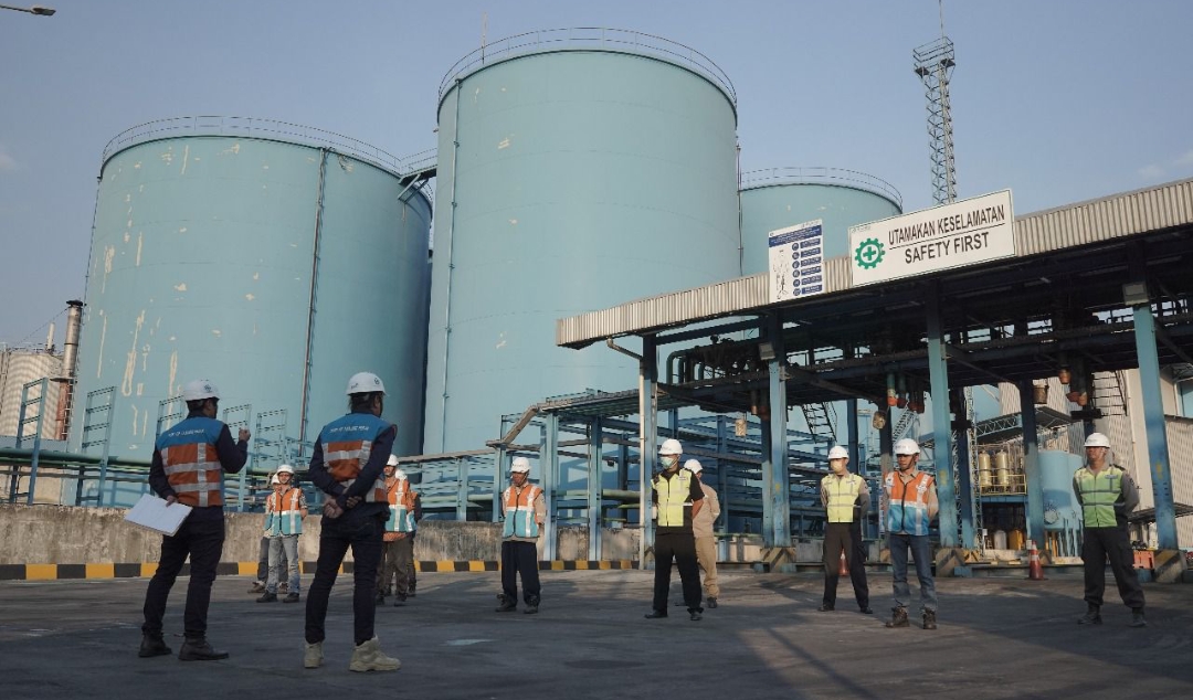 Sejumlah petugas melakukan apel kesiapan operasional di area fasilitas terminal dengan latar tangki penyimpanan, sebagai bagian dari upaya memastikan kelancaran layanan dan keselamatan kerja selama periode Angkutan Lebaran 2026.