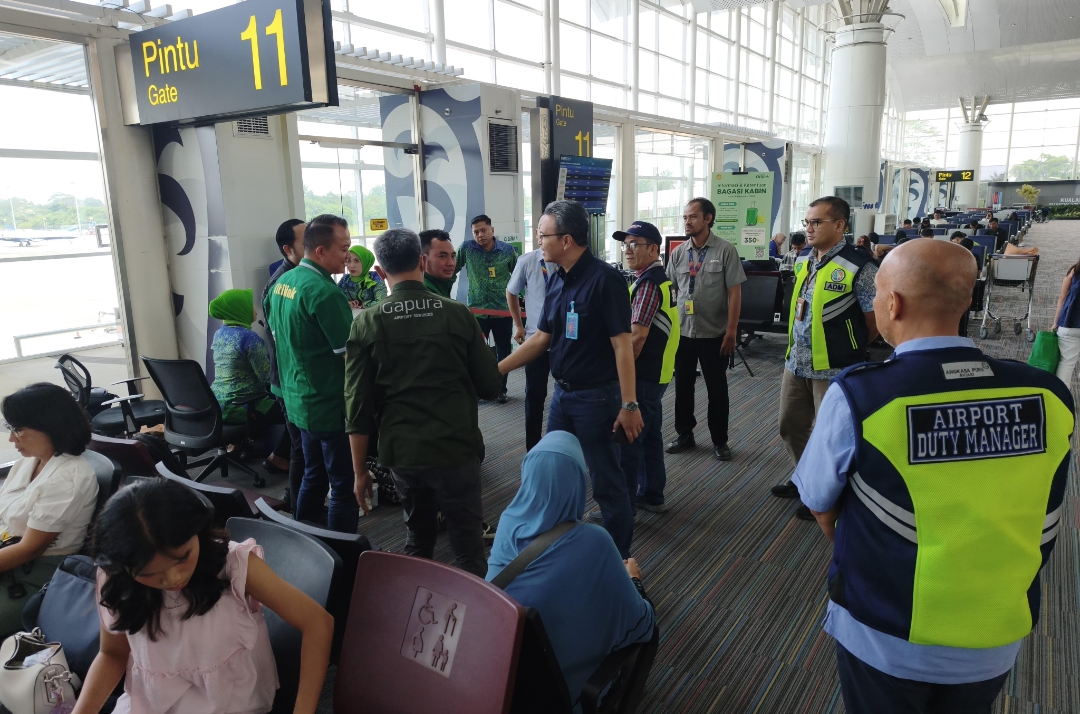 Petugas Bandara Kualanamu bersama jajaran manajemen melakukan peninjauan langsung di area keberangkatan guna memastikan kelancaran operasional dan pelayanan penumpang selama Angkutan Lebaran 2026.