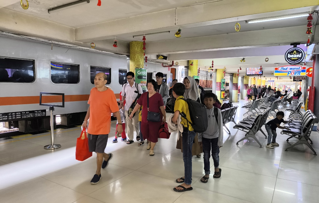 Penumpang kereta api di Stasiun Medan bersiap melakukan perjalanan arus balik Lebaran 2026, seiring PT Kereta Api Indonesia (Persero) menghadirkan promo tiket diskon hingga 20 persen.