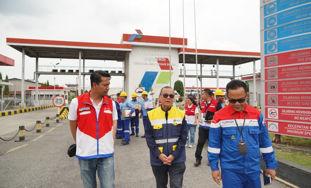 Kunjungan dilanjutkan ke Fuel Terminal Medan Group untuk meninjau kesiapan infrastruktur penyaluran BBM, mulai dari proses penerimaan, penyimpanan, hingga distribusi ke berbagai wilayah.