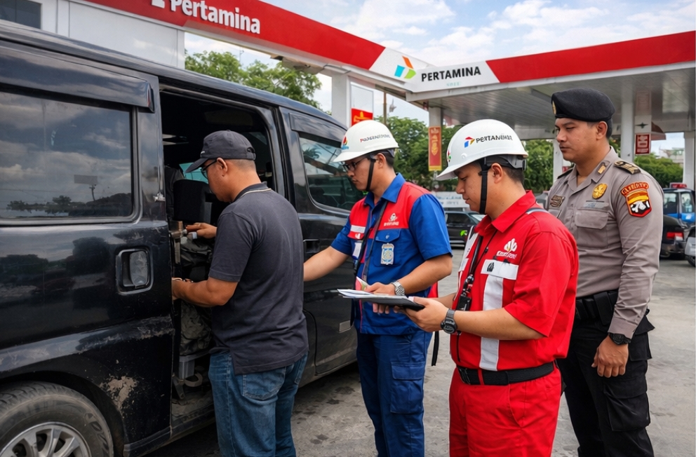 Petugas Pertamina bersama aparat kepolisian melakukan pemeriksaan kendaraan di area SPBU di Deli Serdang guna memastikan penyaluran BBM subsidi tepat sasaran dan sesuai ketentuan.