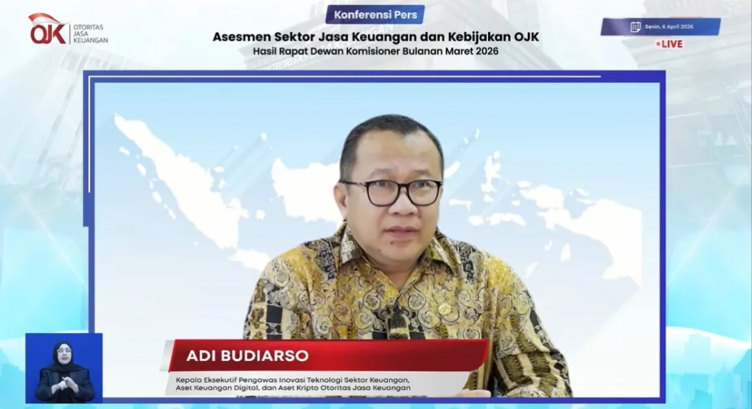Kepala Eksekutif Pengawas Inovasi Teknologi Sektor Keuangan, Aset Keuangan Digital, dan Aset Kripto Otoritas Jasa Keuangan, Adi Budiarso, menyampaikan paparan dalam konferensi pers Asesmen Sektor Jasa Keuangan dan Kebijakan OJK hasil Rapat Dewan Komisioner (RDK) Maret 2026, Senin (6/4/2026).