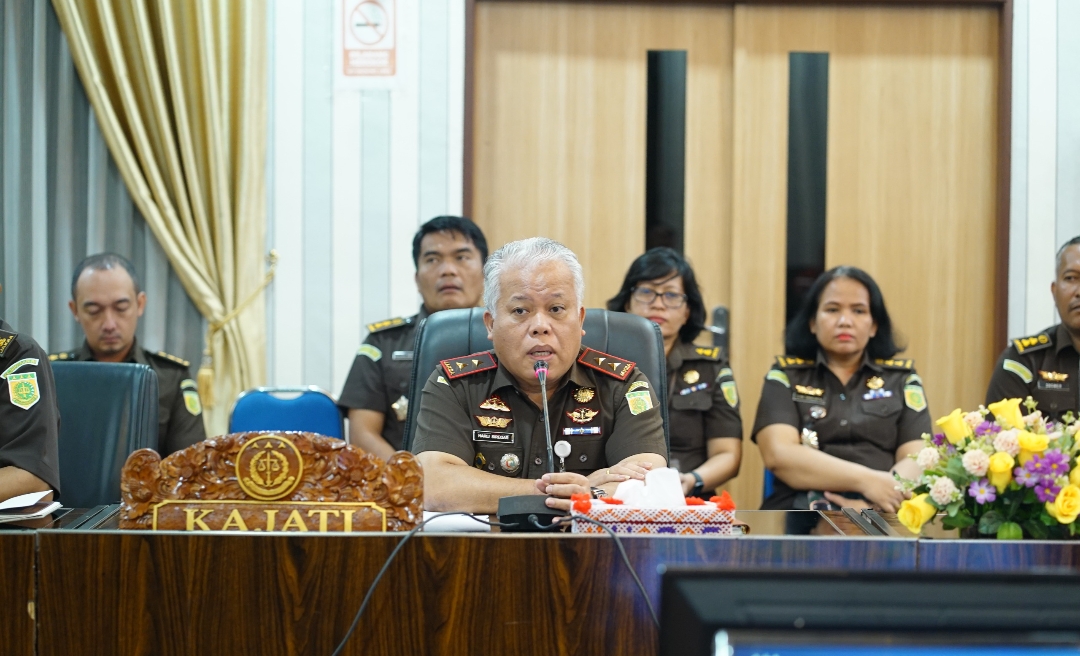 Kepala Kejaksaan Tinggi Sumatera Utara, Harli Siregar, didampingi jajaran pejabat struktural, menyampaikan paparan saat menerima audiensi DPD Partai Demokrat Sumatera Utara di Aula Cipta Kerta, Kantor Kejati Sumut, Medan, Selasa (7/4/2026).
