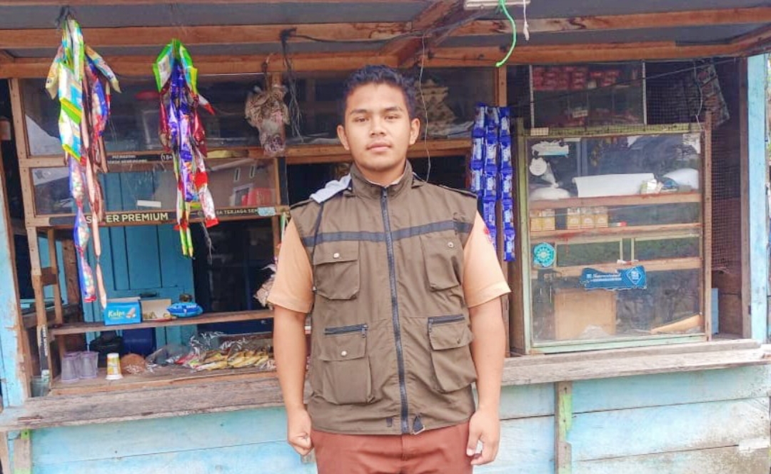 Khairun Alfi Panggabean berpose di depan warung milik keluarganya di Lumban Siagian, Tapanuli Utara. Di sela kesibukan membantu orang tua, ia berhasil menorehkan prestasi dengan lulus SNBP 2026 ke Program Studi Hukum di Universitas Sumatera Utara.