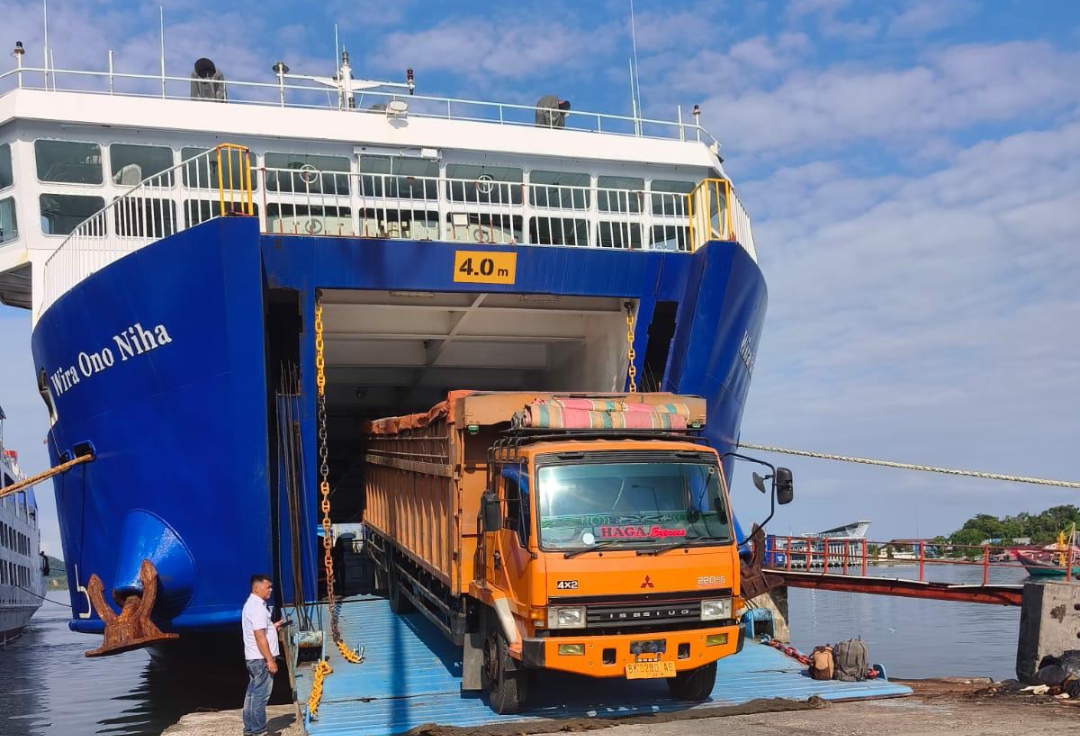 Kapal Wira Ono Niha milik PT Wira Jaya Logitama Lines mengangkut kendaraan logistik di pelabuhan, mendukung konektivitas dan distribusi barang antarwilayah kepulauan di Sumatera Utara.
