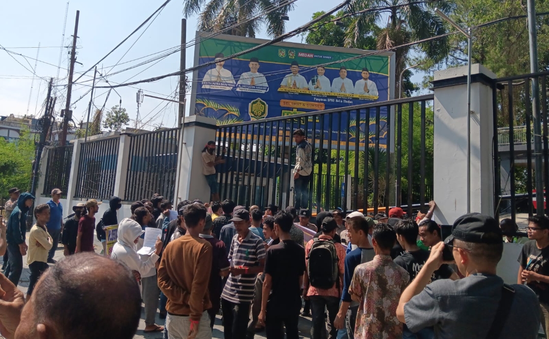 Ratusan massa dari warga dan mahasiswa menggelar aksi unjuk rasa di depan Kantor Wali Kota Medan, menuntut penindakan tegas terhadap bangunan tanpa PBG di kawasan Titi Kuning.